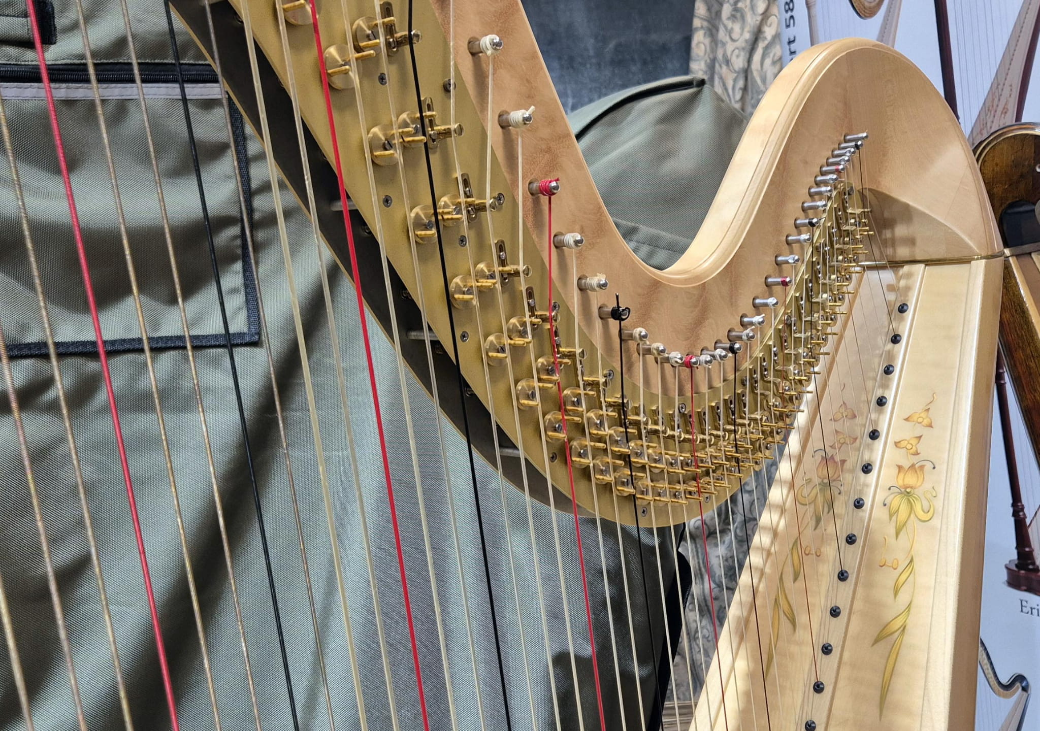 Harfa sprzedawana razem z kluczem do strojenia, pokrowcem przeciwkurzowym i dwuczęściowym pokrowcem transportowym.